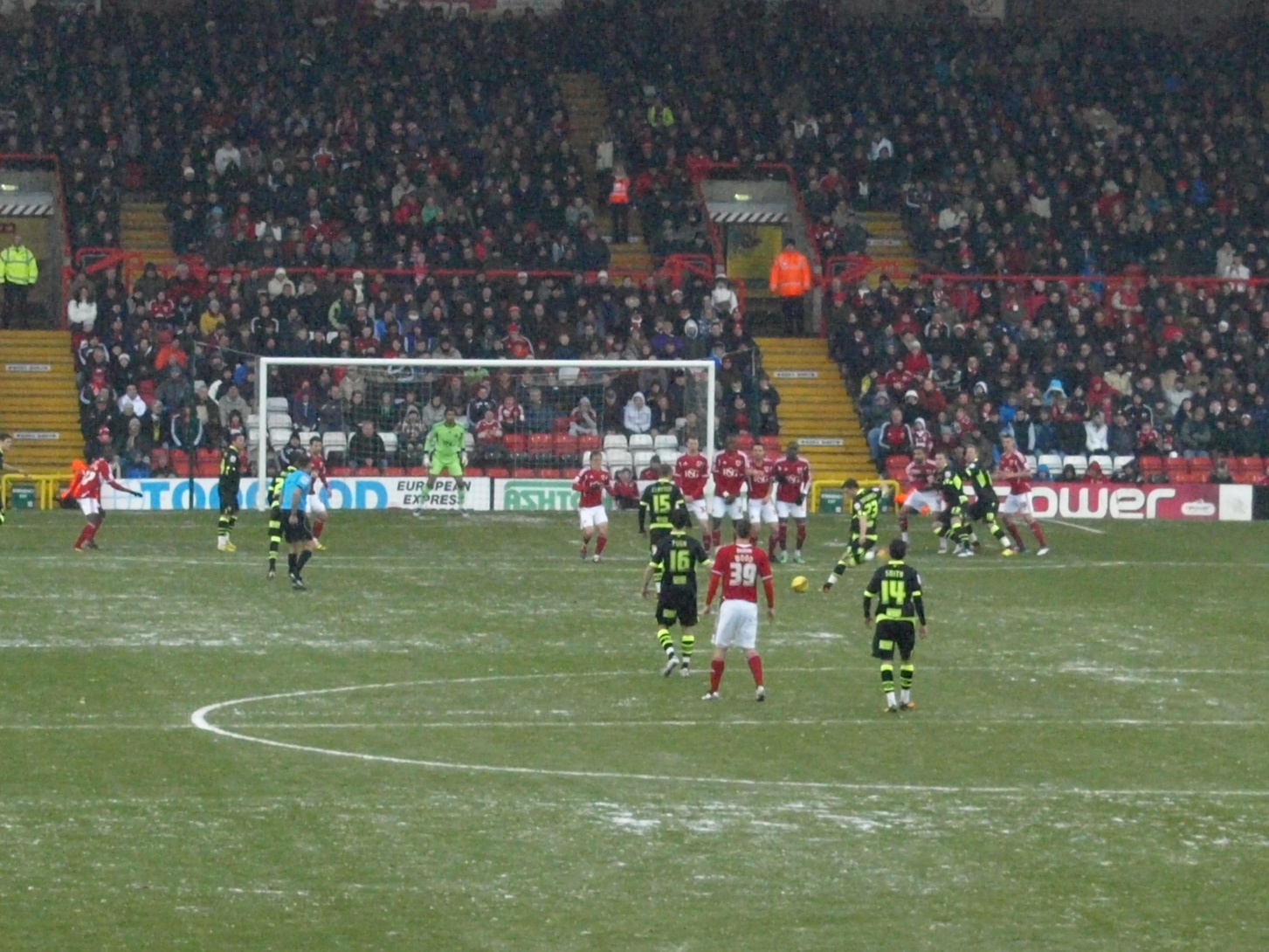 Neil Redfearn's first team sheet didn't contain many surprises. Pugh returned to full back whilst White took Townsend's wide berth. Adam Smith made his debut at right back. Other than that it was the same as Tuesday night. The snow was doing it's best to fall as we made our way to the ground. Justin's attire or more to the point lack of it attracted amusing attention from the majority of other fans all wrapped up to keep out the cold.